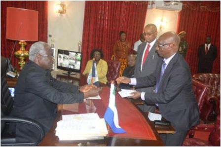 Cluff Gold Sierra Leone has paid their 2012 -2013 surface rent and chiefdom development funding to land owners and community stakeholders in the Valunia Chiefdom Bo District over the weekend witnessed by local authorities and government officers. (Photo: Paramount Chief of Valunia Chiefdom JB Vonjoe flanked by Cluff Gold Country Manager Alusine Jalloh handing over the cheque to Director of Mines Jonathan Sharkar )