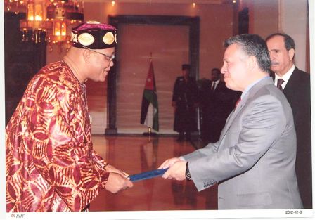 During the presentation at a well-attended and colourful ceremony, Ambassador Kamara conveyed warmest greetings and felicitations from His Excellency Dr. Ernest Bai Koroma, the Government and People of the Republic of Sierra Leone to His Majesty King Abdullah II Bin Al-Hussein.