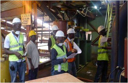 In fulfillment of its mandate to protect people and the environment from the harmful effects of radiation, a team of regulators from the Nuclear Safety and Radiation Protection Authority (NSPRA) conducted inspections at the Sierra Rutile Limited (SRL) Wet and Dry Plants and its Floating Dredge and also conducted Source Search around the vicinity of the mines at Mokanji for orphan radiation sources which may have been abandoned during the 10 years civil conflict with the aim of removing any of the sources and bring them under regulatory control. (Photo: Regulators at Dry Plant at Sierra Rutile Limited)