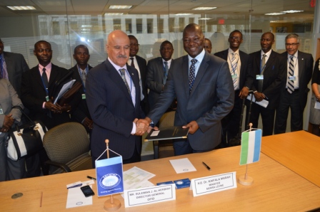 Sierra Leone’s Hon. Minister of Finance and Economic Development Dr. Keifala Marah has on behalf of the Government and People of Sierra Leone signed a Thirteen Million United States Dollars ($13Million) loan with the Director General of OPEC Fund for International Development (OFID) Suleiman Jassir Al-Herbish at the premises of the World Bank on 19NW & H Street in Washington DC.USA. (Photo: Finance Minister Dr. Keifala Marah OFIDs Director General Suleiman Jasir Al-Herbish exchanging Documents during the signing ceremony)