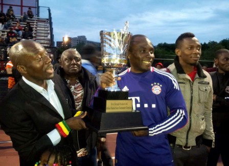 The 87th minute goal from a free kick by forward Michael Osei – popularly known as Ember, a former member of Ghanaian national team Black Stars, as well as Ghana club champion Asante Kotoko, gave Ghana a 1-0 victory over Senegal to win African Advisory Council of Bronx (AACB) 2013 African Nations Cup, Saturday in New York. (Photo: l-r Ghana’s Coach Baffour Acheampong and Edwin Gboney – Goalkeeper)
