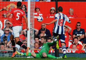 Last weekend in the Premiership, although both Manchester clubs suffered defeats in games they were expected to win, it was the red half of town that should feel most concerned about their team’s chances this season following United’s 2-1 home loss against West Brom. It was the first time that Albion had beaten United in the Premier League and what was surprising about the result was not necessarily that the away side came away with all three points, but that they fully deserved to do so having been the better team for the majority of the game and the scoreline did not flatter them. In particular, West Brom’s two goals were eye-catching, the first a fantastic solo run by Morgan Amalfitano – who ran from inside his own half, nutmegged Rio Ferdinand, then faked David de Gea before lifting the ball over him and into the net; the second was a classy team move finished with a strike by Saido Beharino from just outside the area. Manchester United had equalized through a Wayne Rooney free-kick, which was more luck than judgement as the ball evaded everyone on its way to bouncing into the goal untouched, but the home supporters – who clapped Albion off the pitch in recognition of their good performance – should be worried about how their side is looking under the management of Moyes. So far this season in the league, they have beaten Swansea and Crystal Palace, drawn at home with Chelsea, and lost to West Brom, Liverpool and Manchester City; which means for only the second time in the Premiership era, the reigning champions have lost three of their opening six matches (the other team to do that was Blackburn in 1995/6). (Photo: Amalfitano opens the scoring against United with a beautiful solo goal)