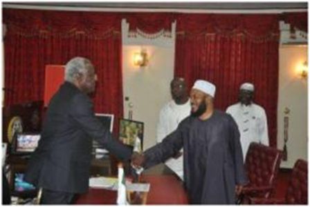 The Chancellor of Islamic Online University (IOU), the Jamaican/Canadian born, Dr. Bilal Philips commonly known as Abu Ameenah, based in Qatar, visited the Chancellor of University of Sierra Leone (USL) His Excellency the President Dr Ernest Bai Koroma, in his office at State Hosue last Monday December 8, 2013. After briefing him about the activities of IOU, Dr Bilal handed over a cheque of $US 50,000 in favor of Voice of Islam Radio (FM102.0). The donation according to Dr. Philips is meant for the development of VOI in its coverage across the country. (Photo: Dr. Bilal Philips in warm hand shake with P.Koroma)