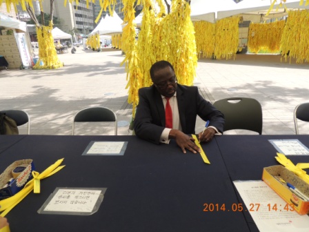 As part of the celebrations to commemorate Africa Day in South Korea, His Excellency Omrie Golley joined his colleagues from the African continent resident in Seoul, on 27th May, in paying respects to the victims of the recent Sewol ferry disaster in the country which claimed hundreds of lives. This disaster has remained a national tragedy in the Southern Asian country.