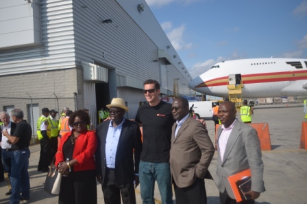 September 20, 2014 – The largest United States – origin emergency Air lift on Ebola Virus Disease (EVD) from the United States of America to Sierra Leone and Liberia to date, has on Saturday September 20th 2014, departed the New York’s John F. Kennedy Airport on board a chattered Korean Airliner for the duo Countries, after a very brief and impressive ceremony held at Cargo building No.9 that was attended by very high profiled government officials of Liberia and Sierra Leone. (Photo: Andrew MacCalla, Director International Progrms & Emergency, Direct Relief (Center), Amb.Bockari Stevens (2nd Left) Amb. Minah (2nd Right), Mrs. Isatu Sillah(1st left) Mr.Fawundu (1st Right) the 7-4-7 at the back)