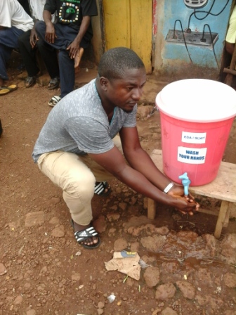 Like all the markets in Freetown, it’s business as usual at the Calaba Town market along the long stretch muddy Main Motor Road in east end Freetown; a scene that contradicts the picture being painted by the international media of a country gradually succumbing to an outbreak of the dreaded Ebola Virus Disease-EVD. The market is so busy there is hardly any room for vehicles to go through. Sensie Magnus performs daily Ebola prevention ritual before joining his colleagues at the Friendship Ataya Base
