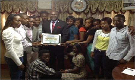 The Commissioner of the Anti-Corruption Commission (ACC) has been named HERO OF THE YEAR by the Sierra Leone Children’s Aid Foundation (SLCAF), a youth based organization comprising students from colleges and secondary schools. The President on behalf of the group presented the award to the ACC Commissioner, Joseph Fitzgerald Kamara for his exemplary role in the fight against corruption in the country on Tuesday 10th February 2015, at the Commission’s Gloucester Street Office in Freetown. (Photo: The Commissioner of the ACC and members of the Sierra Leone Children’s Aid Foundation)