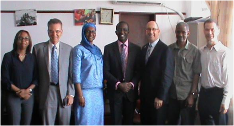 Freetown, Oct. 13, 015 (MOHS) – The Senior Consultant Public Health Laboratory Specialist, Haja Dr. Isatta Wurie has presented a five-man visiting team from the Association of Public Health Laboratories (APHL) Maryland, USA to the Minister of Health and Sanitation Dr. Abu Bakarr Fofanah to acquaint him about their mission. Health Minister in photograph with high profile APHL Team: third from R-L Scott J. Becker APHL Executive Director, Health Minister, Dr. Abu Bakarr Fofanah and Haja Dr. Isatta Wurie, Senior Consultant Public Health Laboratory Specialist