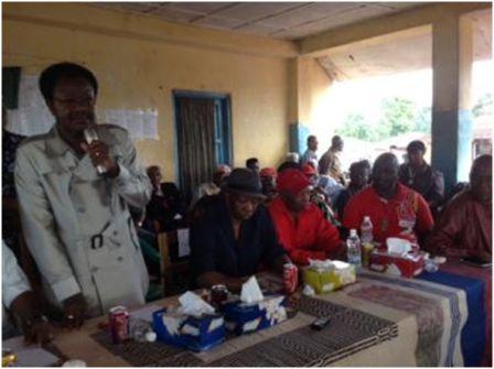 Kenema, November 3 (SLENA) – Former Head of State, Captain Valentine E. M. Stresser last week traversed the Eastern Region with Vice President, Ambassador Dr. Victor Bockarie Foh on social mobilization and community involvement in the fight to finally eradicate the world’s most dangerous enemy. (Photo: VP Foh, addressing Malema Chiefdom people, flanked by party officials including Strasser)