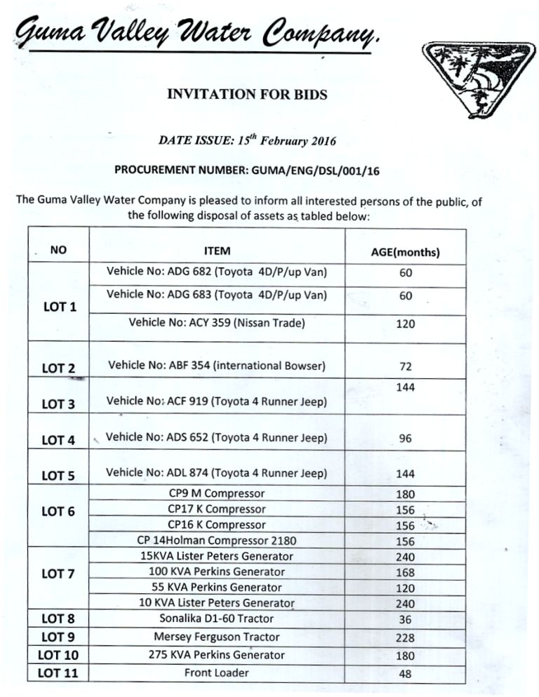 Guma Valley Water Company, invitation for bids requested. Date of issue: 15 February 2016.