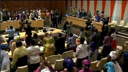 There was pure jubilation inside the United Nations Economic and Social Council (ECOSOC) Chambers Friday for the launch of the African Women Leadership Network. (Photo: Participants wave flags inside UN ECOSOC Chambers after the official launch of African Women Leadership Network in New York)