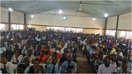 The principal of the Milton Margai College of Education and Technology Polytechnic, Dr. Philip Kanu on Thursday 6th December 2018 announced representatives of the Interim Executive of the college’s Students’ Union as Rosaline Kamara, final year Bachelor of Education in Business Studies as Leader of the team, Atila Taylor, final Year Educational Administration, secretary to the team, Abdulai Mansaray, Higher Teachers’ Certificate Final, Business Studies, Abdulai Habib, Civil and Building Engineering and Jene Baion clarifying that the Interim Executive would hold the fort until elections are held next year. (Photo: Cross-section of students at the ceremony)