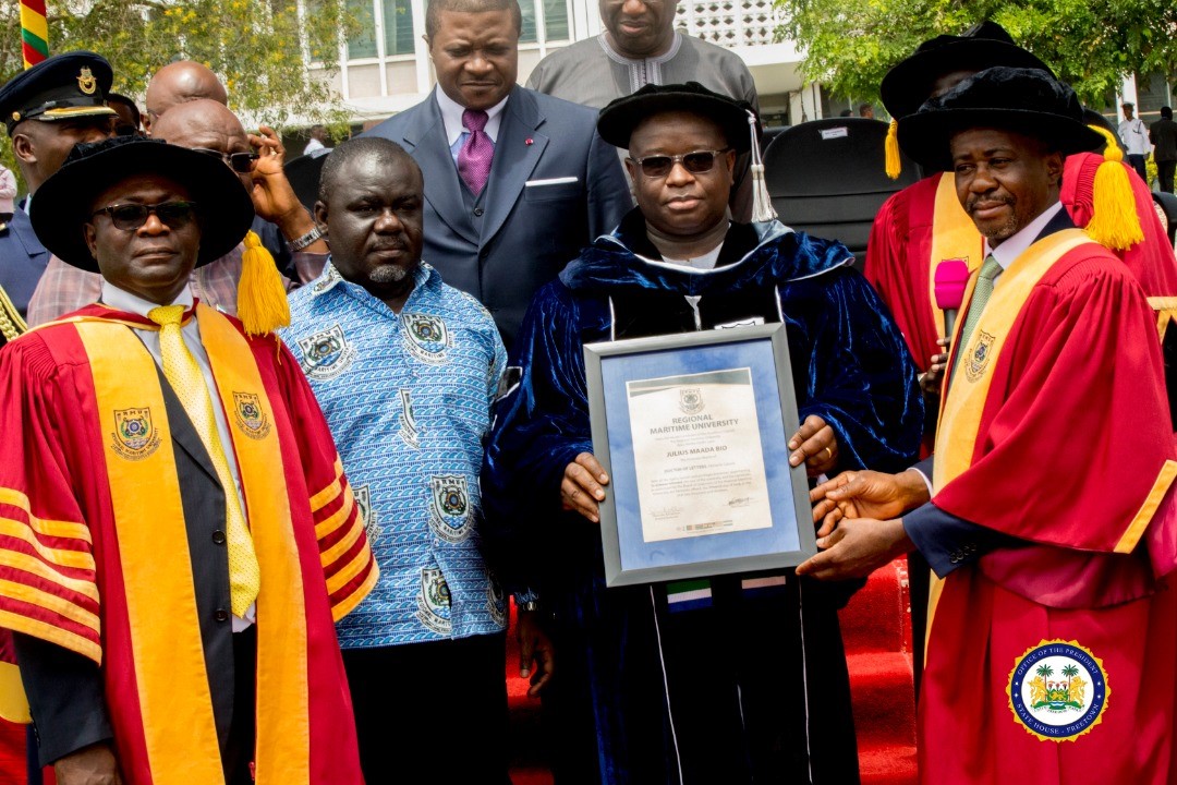 The Regional Maritime University (RMU) of Ghana has conferred an honorary Doctorate Degree on His Excellency, President Julius Maada Bio, at the University’s Thirteenth Congregation for the award of degrees and diplomas in Accra, Ghana.