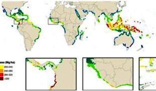 Cambridge, UK. A new study maps out the amount of carbon stored by mangrove ecosystems in various parts of the world. (Photo: Mangrove carbon map from Hutchison et al (2013). Greatest biomass